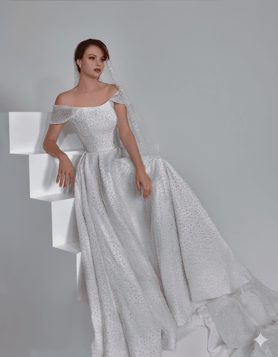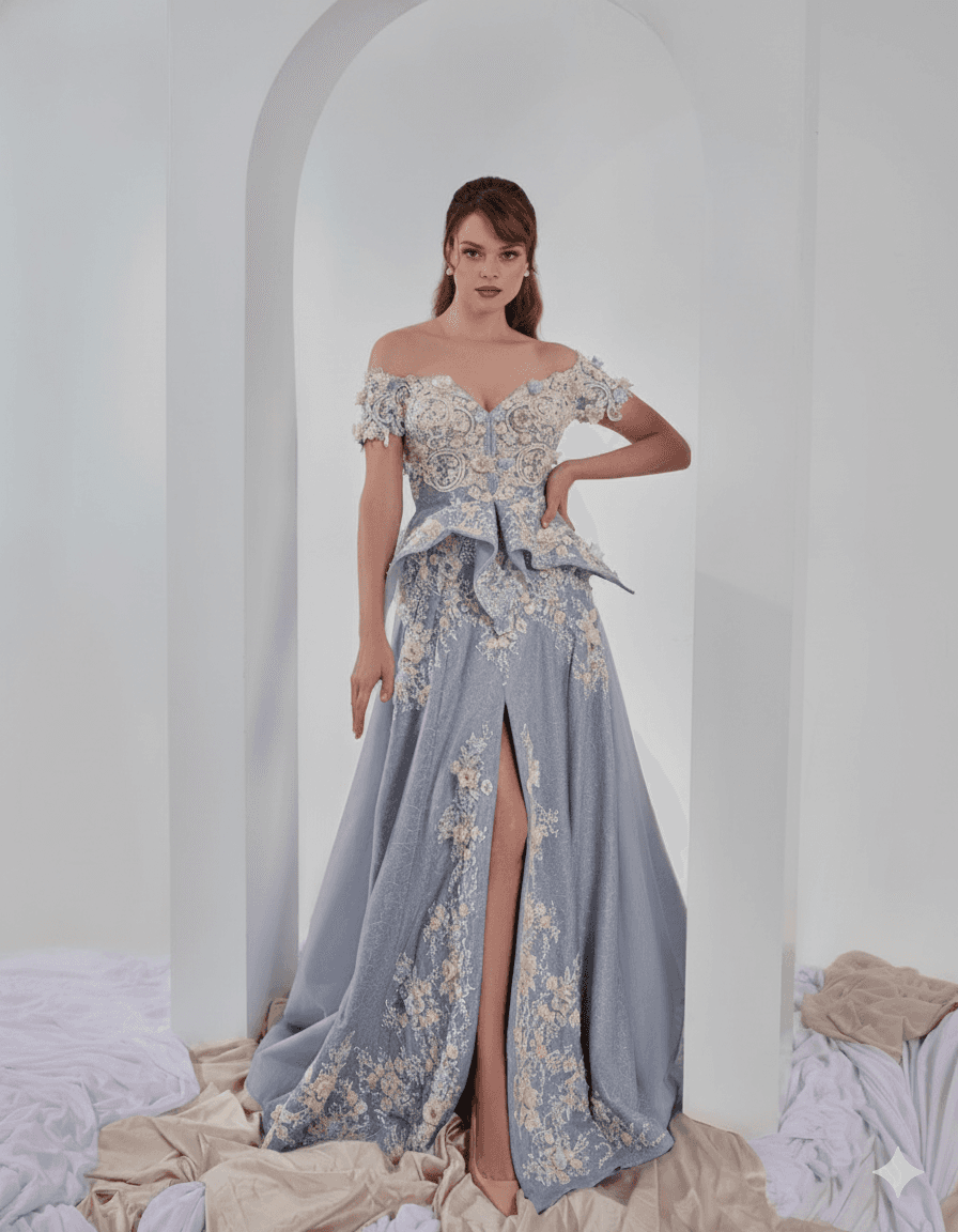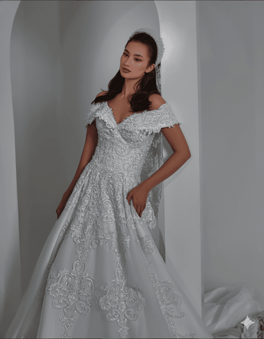 A refined off-shoulder silhouette enhanced by delicate lacework and structured elegance, designed to highlight grace and femininity with every movement.