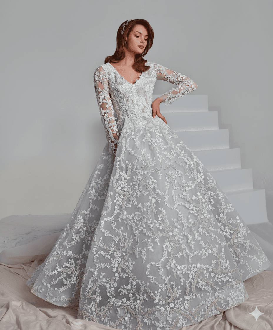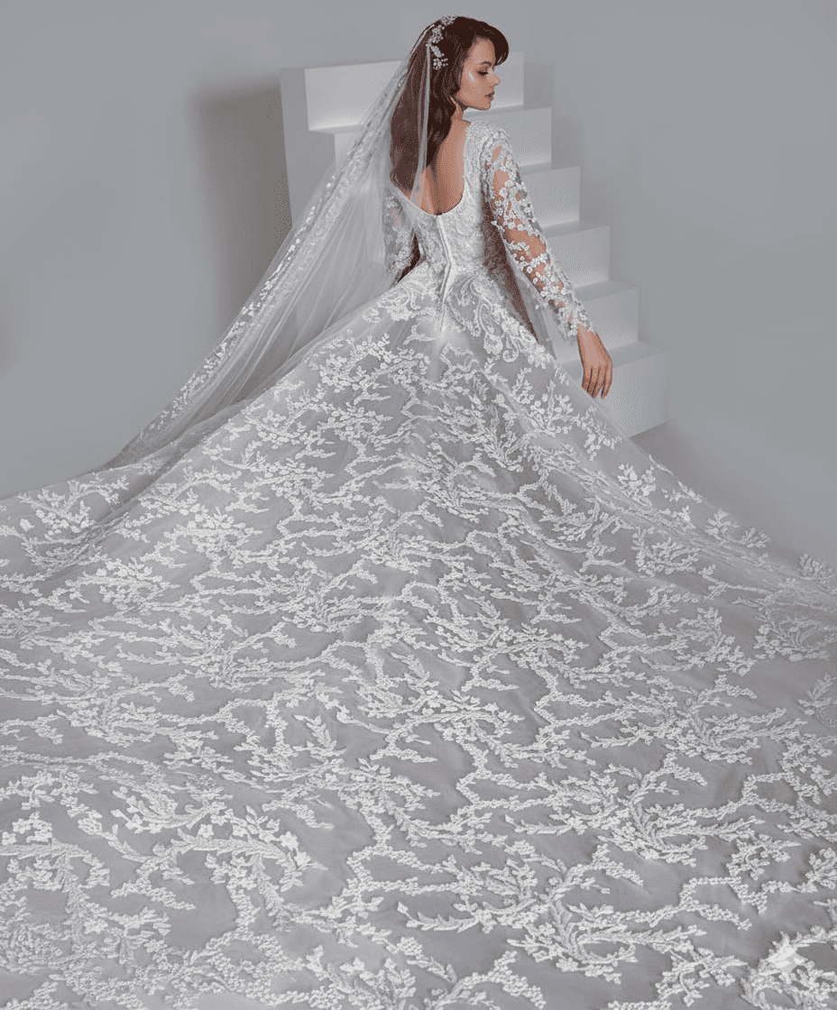 An exceptional design featuring an extended embroidered train, crafted to create a breathtaking presence for unforgettable bridal entrances.