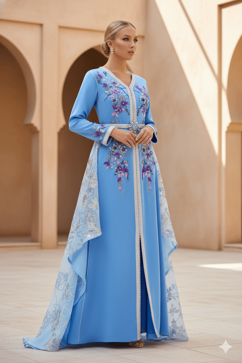 A flowing blue caftan enriched with floral embroidery and a modern silhouette. Designed for elegance and comfort in refined settings.
