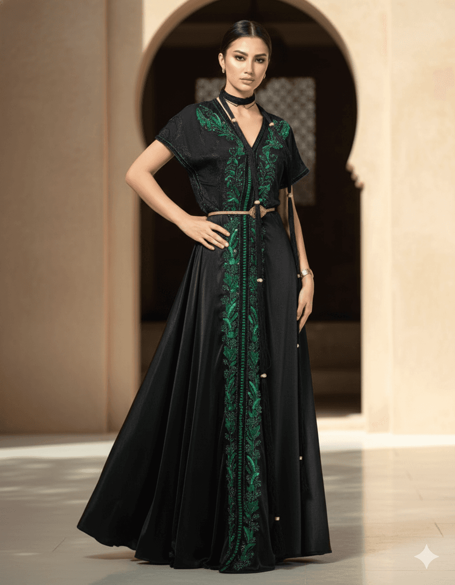 A black caftan accented with deep green embroidery, offering a refined contrast and a modern luxurious aesthetic.