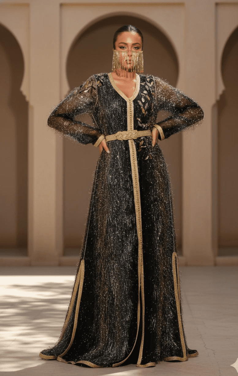 A striking black caftan enhanced with shimmering textures and golden finishes. Cut in Bahrain and meticulously hand-embellished in Morocco, this couture piece reflects bold elegance and refined craftsmanship.